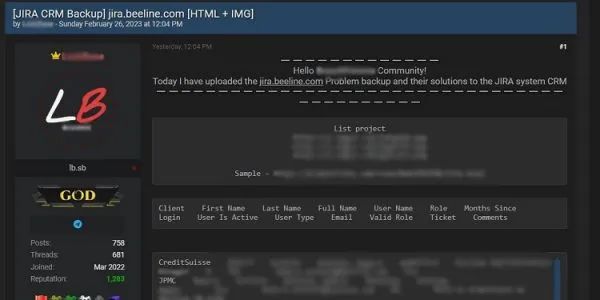 攻击者声称该数据库包含Beeline的客户数据,例如名字、姓氏、Beeline用户名、职位以及其他数据。黑客论坛的帖子表明,这些数据窃取于2月25日。